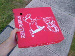 Oggi, invece, mi sono recato da Jesse. I vantaggi di Jesse sono i prezzi bassi (AUD$ 8.90 — forse è un franchising), le numerose offerte (“che non potrai rifiutare”) e l’estrema vicinanza al posto dove vivo (80 metri?). Il proprietario mi pare italiano (o forse è ispano-americano). Il figlio mi ricorda un Fabri Fibra un po’ massiccio e c’è pure un indiano che dà una mano un po’ ovunque. Chiedo una Godfather, cioè una funghi, olive nere, peperoni (che qui si chiamano con il nome latino: capsicum) e salamino piccante. Aggiungo anche prosciutto… tanto mi costa un dollaro [errore:vedi sotto]!