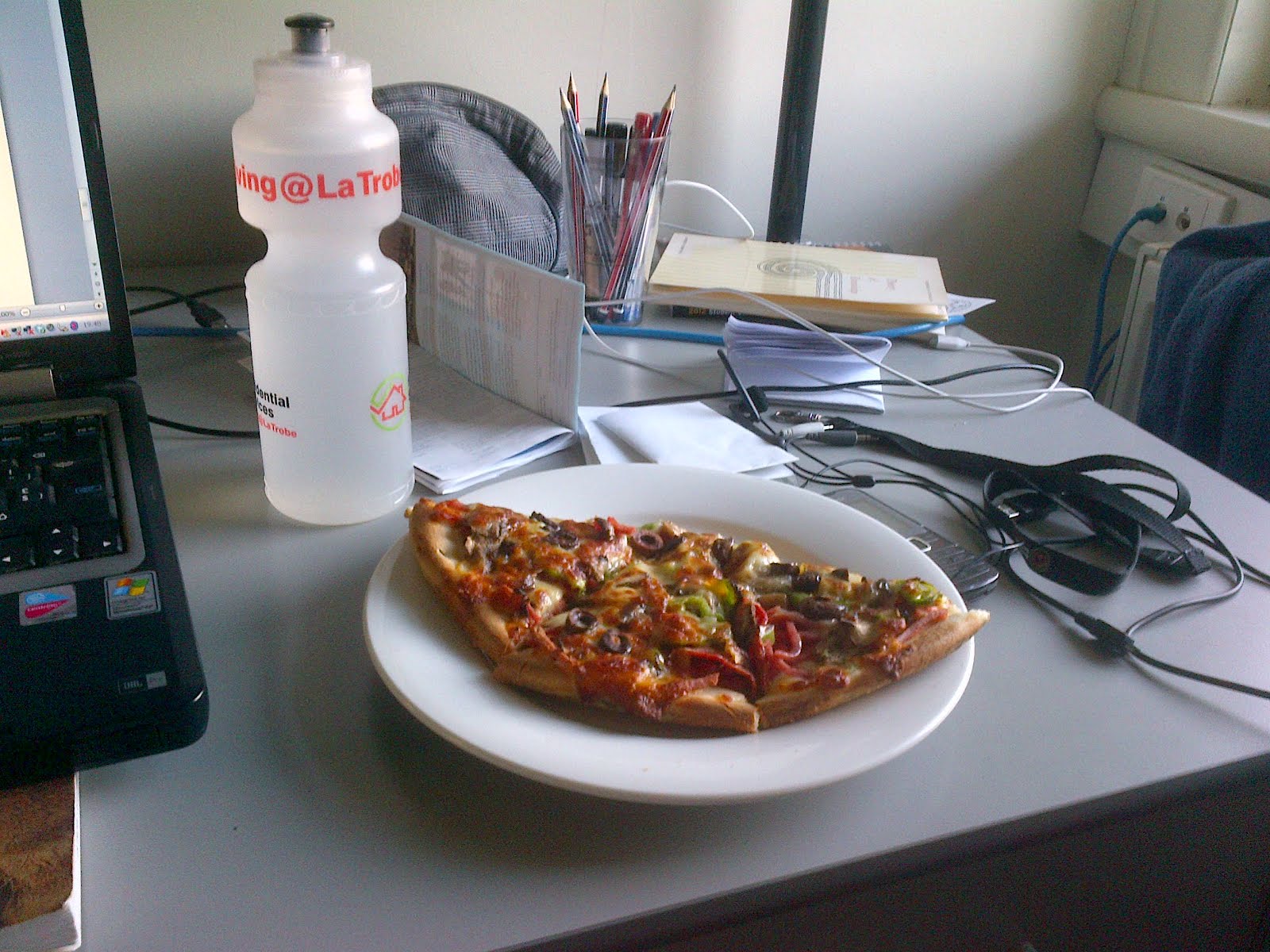 La settimana scorsa mi sono recato da Sinner’s, un po’ per pigrizia e un po’ perché non avevo intenzione di cucinare dopo ore di camminata. Ho avuto così occasione di fare conoscenza per la prima volta di questo delizioso ed elaboratissimo alimento, così come è stato trasmesso agli Australiani dalle nostre madri fondatrici (e padri fondatori) o, più semplicemente, dal mercato globale. Come osserverete dalle foto che seguono, pare un’ibridazione tra una focaccia e una pizza vera e propria, in tipico American style. Il suo punto di forza, secondo me, è il formaggio gustoso, il prezzo abbordabile e la croccantezza dei funghi. Anche le olive non sono male, perché fresche e totalmente australiane.