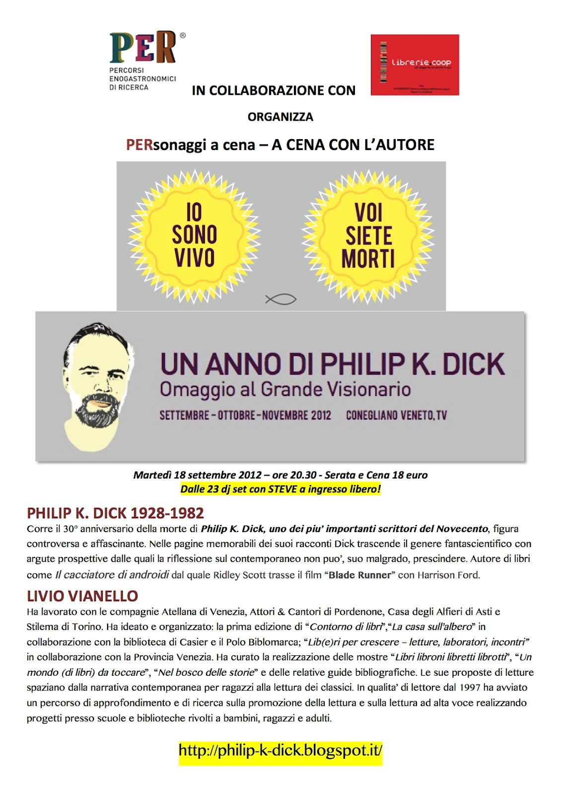 Sempre in collaborazione con la nostra libreria di fiducia, Librerie.coop – centro comm. Conè di Conegliano, partecipiamo alla prima serata di presentazione di un bellissimo progetto denominato “UN ANNO DI PHILIP K. DICK – Omaggio al grande visionario”, in occasione del 30esimo della sua scomparsa. Concerti, cinema, CUCINA, fumetti, ma anche LETTURE! Conoscete “Blade Runner”? ebbene sì, Ridley Scott girò questo film CULT, ispirandosi proprio al libro DI DICK “Il cacciatore di androidi” del 1968.