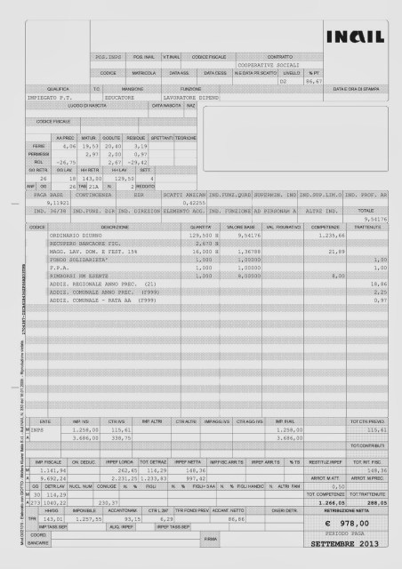 Sono una lavoratrice del sociale privato, cooperative tanto per capirci, e qui di seguito pubblico la mia busta paga del mese di settembre. La pubblico per informare tutte quelle persone che non sanno cosa significa lavorare con dei contratti di lavoro al limite della legalità, della sopravvivenza e appunto della dignità. La mia vuole essere una denuncia su tutti quei contratti di lavoro che non danno la possibilità alle persone di vivere un’esistenza libera e dignitosa.