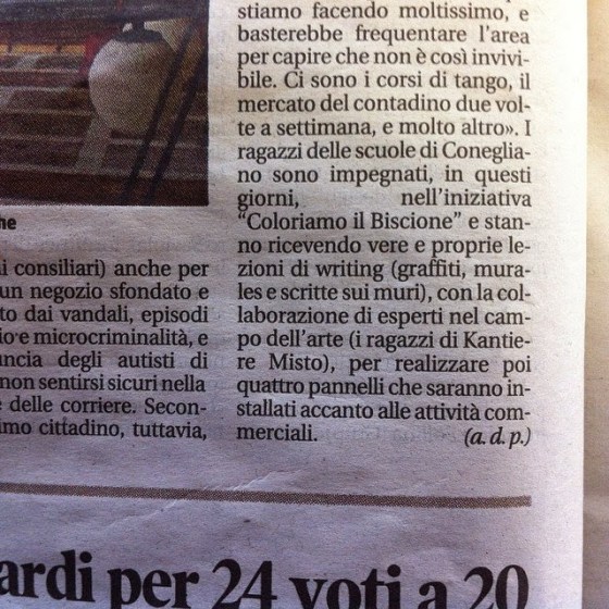 … la vicina città di Conegliano, conoscendo la forza educativa della Street Art ha incaricato l’associazione Kantiere Misto, tramite il progetto COLORIAMO IL BISCIONE, a svolgere attività di writing ed educazione ambientale con gli studenti delle scuoe medie. Non voglio soffermarmi oltre, ma semplicemente ricordare che tutte le attività che sono svolte dai volontari delle associazioni nel nostro territorio sono da valorizzare e sostenere e le belle parole o i complimenti non sono sufficienti! E’ necessario anche riconoscere il lavoro svolto anche tramite dei riconoscimenti monetari, o almeno dare la possibilità a chi impiega tempo e denaro di rientrare delle spese sostenute.