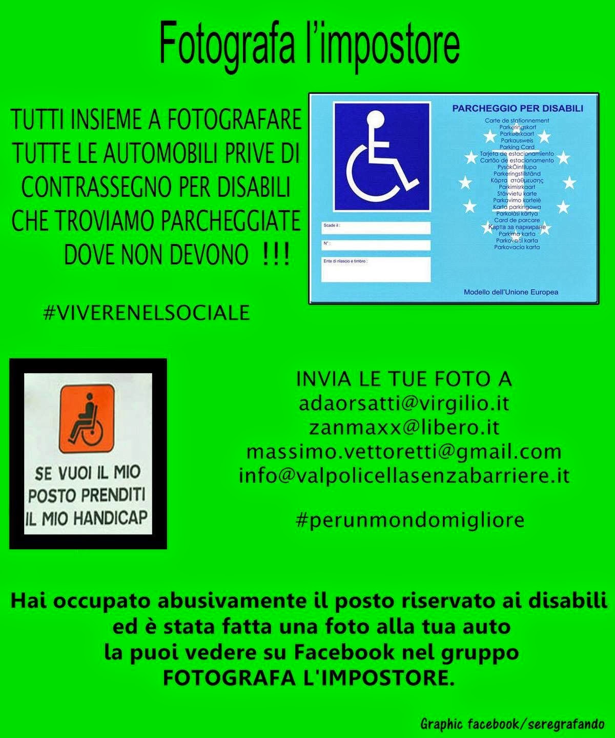 E’ anche in atto la campagna “FOTOGRAFA L’IMPOSTORE” contro i furbetti che utilizzano il parcheggio per disabili, aiutiamoci a diventare più civili e smettiamo di essere scimmie segnaliando ai vigili o carabinieri quando un parcheggio destinato ai disabili è occupato da un normodotato oppure possiamo intervenire con azioni di cittadinanza attiva! A tale proposito è anche disponibile una App nella quale è possibile segnalare direttamente una barriera, una discrimainazione o un’ingiustizia!