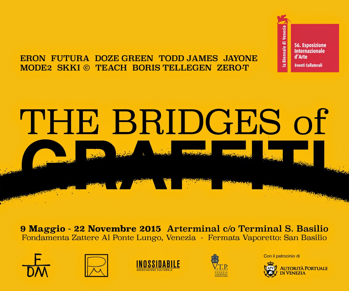 Vi domanderete di cosa vi parlerò: cercherò di essere breve…..altrimenti i lettori del tanto acclamato Maggio Letterario si potrebbero stufare e non arrivare in fondo…..(e poi si sparano 400 pagine di fuffa best-seller fingendosi intellettuali). Comunque voglio parlarvi di ponti…….., non architettonicamente parlando, ma riferendomi a chi poi spesso li dipinge…….i WRITERS (magari di nascosto, illegalmente). Il loop me lo dà una mega pro ….INIZIATIVA al via in quel di Venezia: “THE BRIDGES of GRAFFITI” . No non vi sbagliate, non avete letto male, I GRAFFITI con la G maiuscola approderanno di nuovo a Venezia e lo faranno da gran signori sbarcando all’ARTERMINAL a San Basilio. Un’evento di portata EPOCALE che porterà alcuni dei king di questa forma d’espressione, i GRAFFITI appunto, a esibirsi ridipingendo una delle porte d’ingresso più contemporanee di questa città: VENEZIA. Questa classica metropoli “barocca” dalle differenti anime è, pur se antica e fragile, sempre pronta ad accettare il nuovo, Alcuni la vorrebbero trasformata in un Parco Divertimenti della “Cultura”:un’immenso MUSEO a cielo aperto dove si paga il biglietto per entrare al mattino (cara tassa di soggiorno) e la si lascia alla sera al personale delle pulizie e della sorveglianza per far si che tutto sia apposto il giorno seguente. Ma VENEZIA è pur sempre una città contemporanea e come tutte le metropoli moderne ha i suoi luoghi colti, i suoi degradi, i suoi tempi, i suoi riti……… e in tutto questo i Graffiti come centrano? Centrano centrano: ma incominciamo dall’inizio.