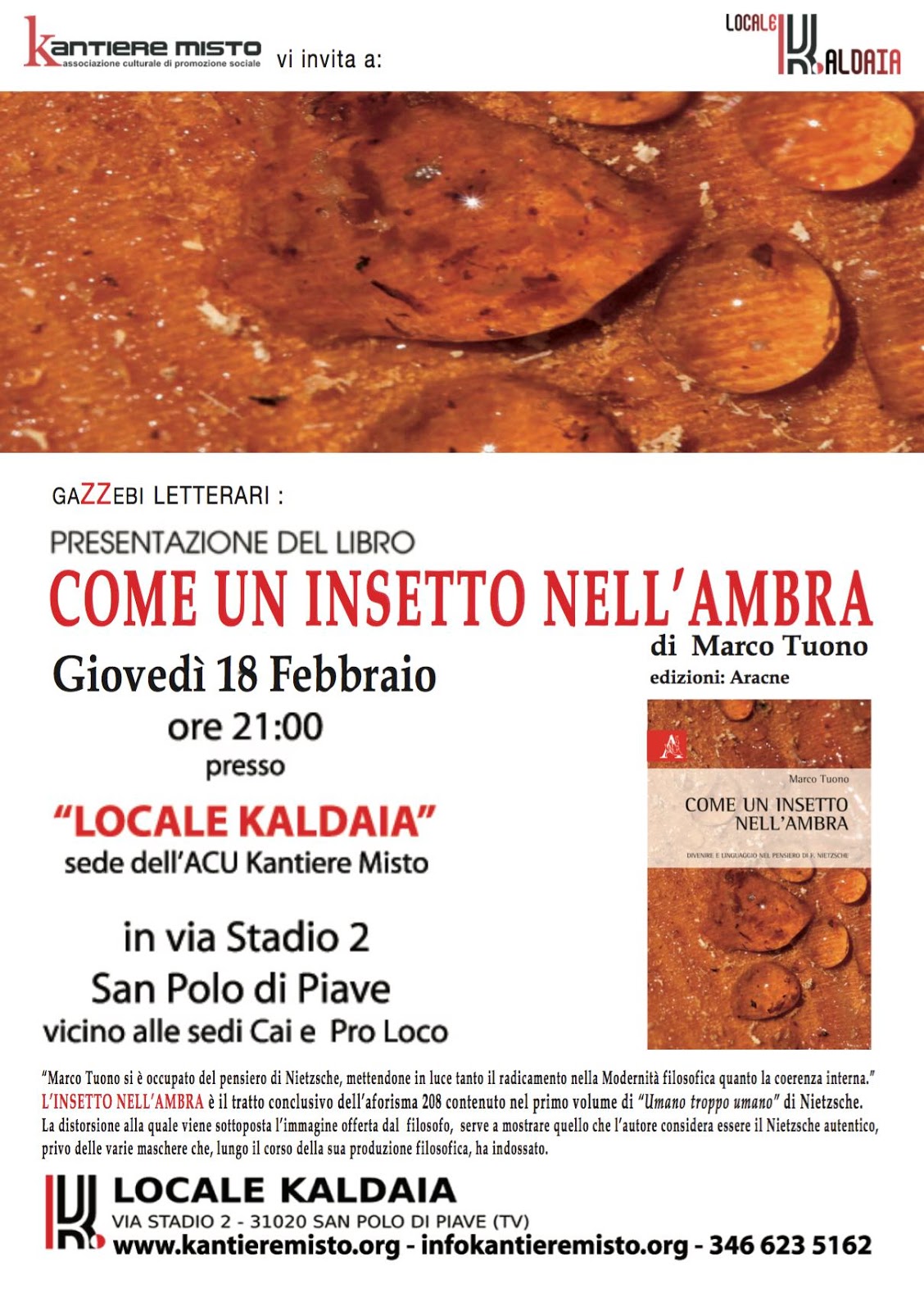 L’autore, che sarà ospite della serata è Marco Tuono, filosofo, al suo primo libro dal titolo: COME UN INSETTO NELL’AMBRA.