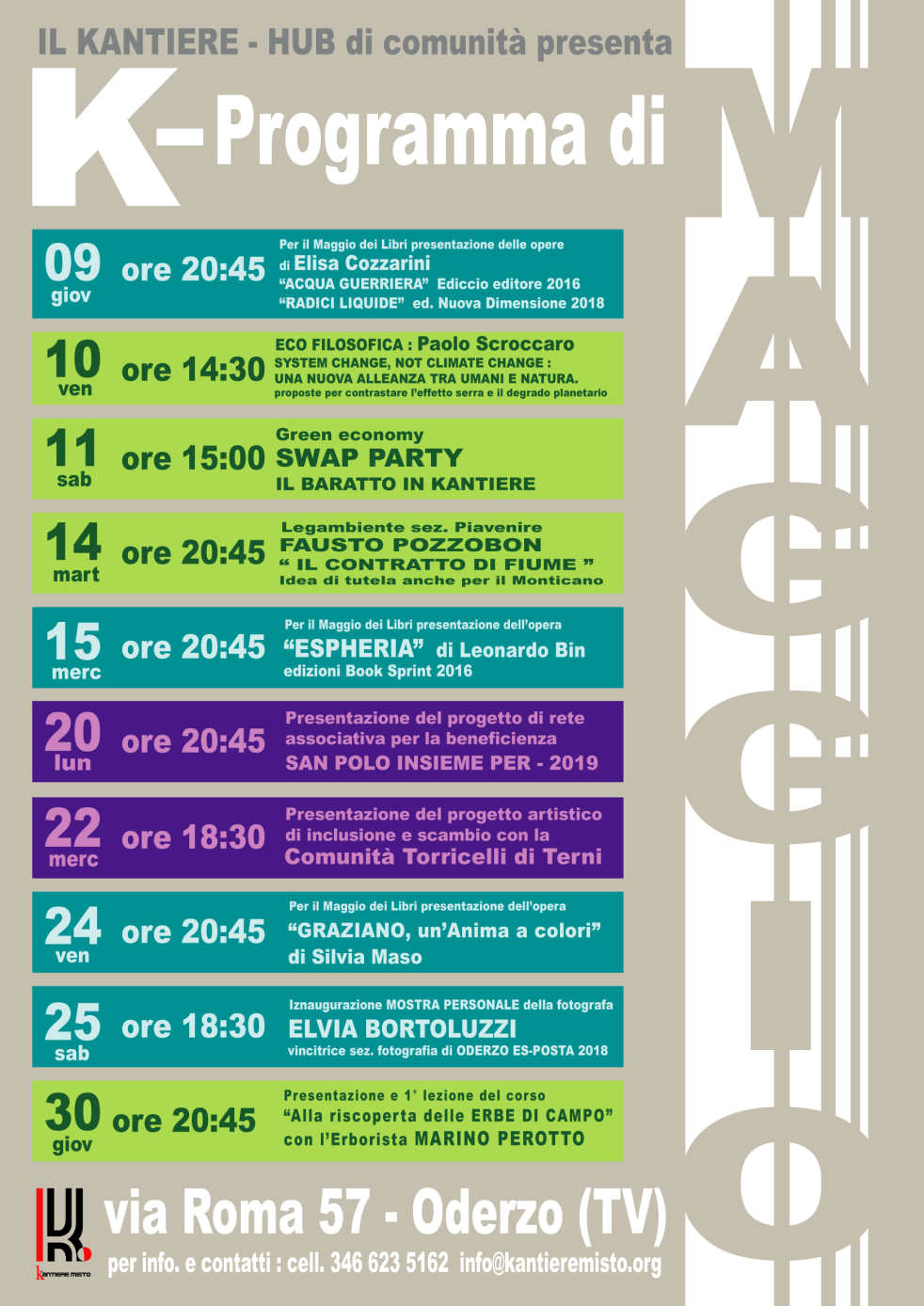 IERI ABBIAMO FATTO UNA GRANDE INAUGURAZIONE,,,,,DOMANI SI INIZIA. ” IL KANTIERE” HUB DI COMUNITA’ ECCO LA PROGRAMMAZIONE DI MAGGIO E LE PRIME INIZIATIVE   COME POTETE VEDERE QUI SOPRA ABBIAMO SCELTO DI DIVIDERE LE NOSTRE INIZIATIVE PER AREE TEMATICHE E ASSOCIARE A QUESTE DEI COLORI   ACQUA MARINA=CULTURA QUESTI SONO I PRIMI LIBRI E AUTORI…… Continua a leggere SI COMINCIA…. PROGRAMMA DI MAGGIO